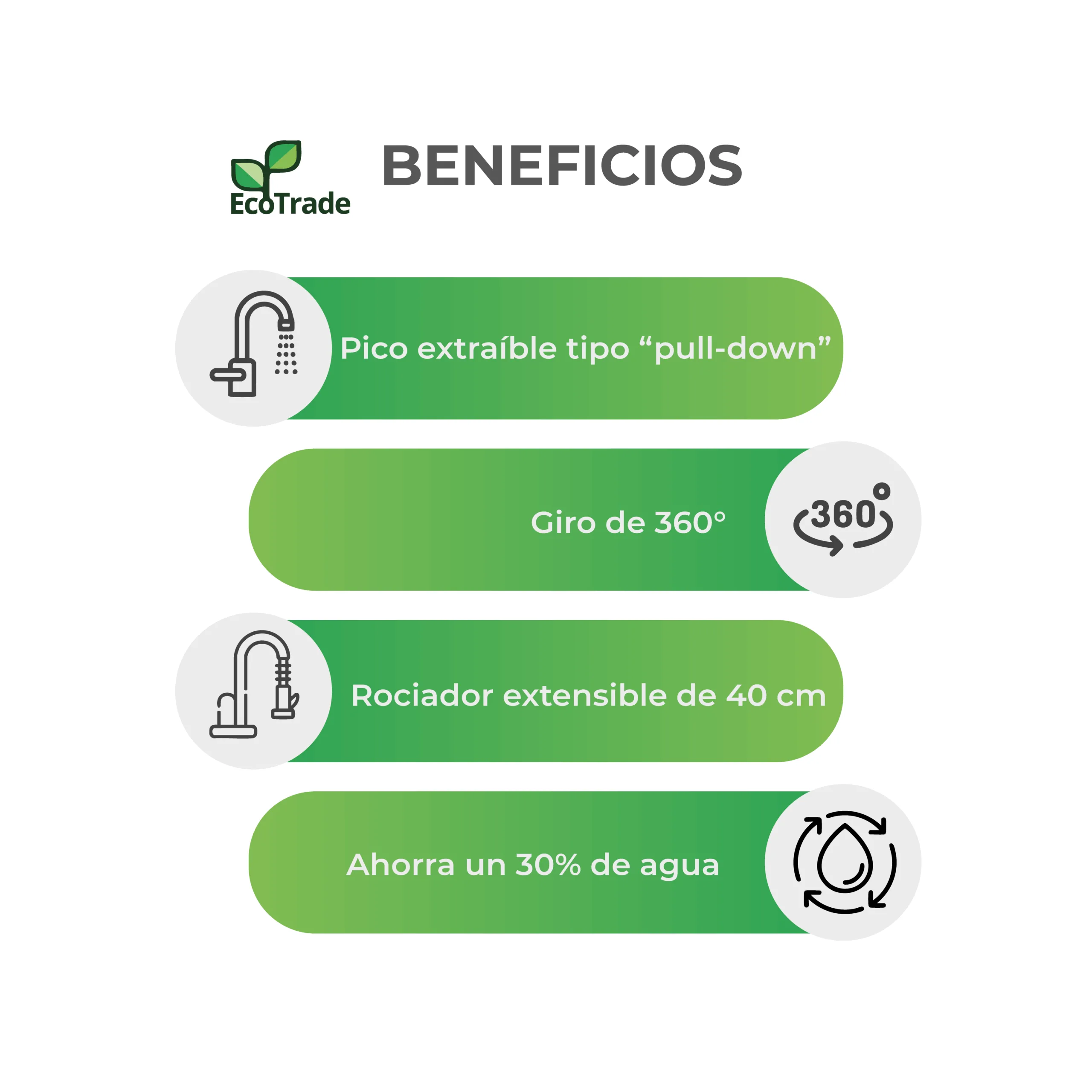 o Pico extraíble tipo” pull-down”, Diseño ergonómico que simplifica tu rutina diaria en la cocina.